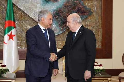 استقبل رئيس الجمهورية السيد عبد المجيد تبون رئيس مجلس الدوما الروسي، السيد فياتشيسلاف فولودين.حضر اللقاء، رئيس المجلس الشعبي الوطني السيد إبراهيم بوغالي، مدير ديوان رئاسة الجمهورية، السيد بوعلام بوعلام، وأمين عام وزارة الشؤون الخارجية والجالية الوطنية بالخارج، السيد الوناس مقرمان.