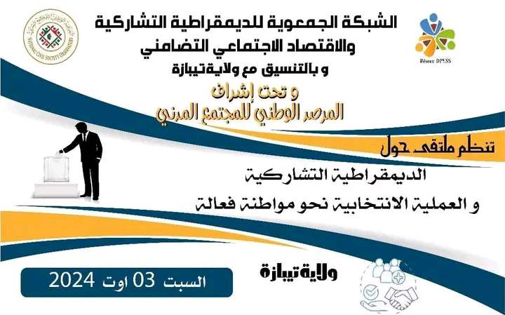 نظمت الشبكة الديمقراطية التشاركية والعلمية والإقتصاد الإجتماعي التضامني فعاليات الملتقى الجهوي حول ” الديمقراطية التشاركية والعلمية الإنتخابية نحو مواطنة فعالة ” .نظم الملتقى الجهوي للشبكة الديمقراطية التشاركية والإقتصاد الإجتماعي والتضامني وذلك بإشراف المرصد الوطني للمجتمع المدني و بالتنسيق مع التعاون ولاية تيبازة شهد هذا اللقاء مشاركة مايقارب 450 مشارك من مختلف أطياف المجتمع المدني .ويهدف هذا اللقاء إلى تعزيز الوعي بمبادئ الديمقراطية التشاركية وأهمية العملية الإنتخابية في تحقيق المواطنة الفعالة في المجتمع ، نظمت جلسة حوارية وورشات تكوينية بإشراف خبراء ومختصين في هذا المجال. صفية حليموش