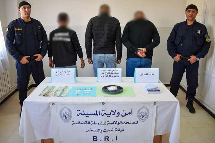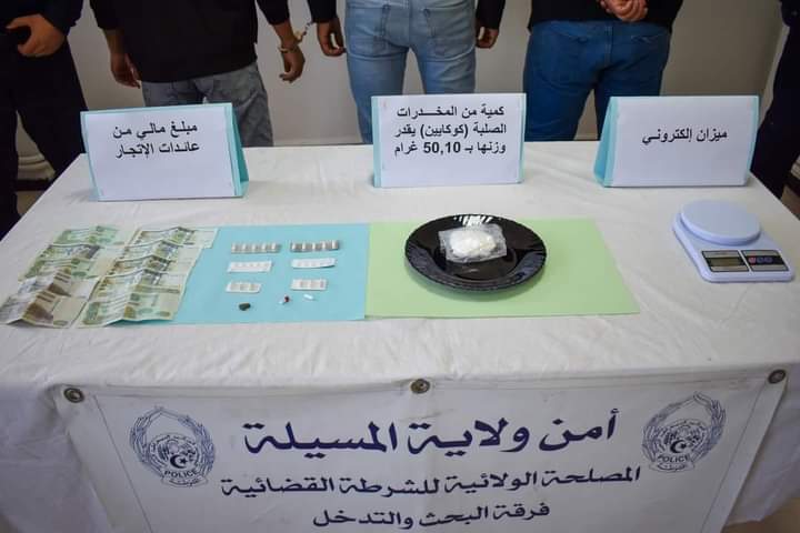 تمكنت شرطة المسيلة فرقة البحث والتدخل BRI بالمصلحة الولائية للشرطة القضائية لأمن ولاية المسيلة من وضع حد لنشاط شبكة إجرامية متكونة من 03 أشخاص، وحجز كمية من المخدرات الصلبة (كوكايين) تقدر بـ 50.10 غرام، و 27 قرص مهلوس من مختلف الأنواع، قطعة من المخدرات، ميزان إلكتروني يستعمل في وزن مادة الكوكايين، بالإضافة إلى مبلغ مالي يعتبر من عائدات الترويج ومركبة سياحية تستعمل في نقل هذه السموم. فضيلة بعلي