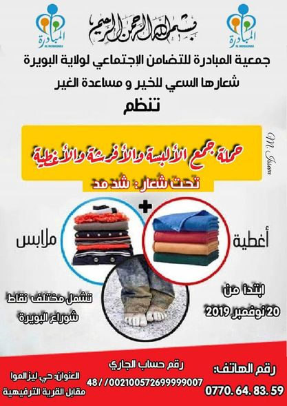 أطلقت جمعية المبادرة للتضامن الاجتماعي لولاية البويرة للسنة السادسة على التوالي، مبادرة حملة شتـــاء دافـــئ تحـــت شعـــار « شد مد ومن خيرك ســـــاعد غيــرك» وذلك بهدف جمع أكبر عدد ممكن من التبرعات لصــــــــالح العائلات الفقيرة و المعوزة بالبويرة، و ذلك بعد نجاح المبادرات السابقة والتي تأتي بطموحات أوسع .