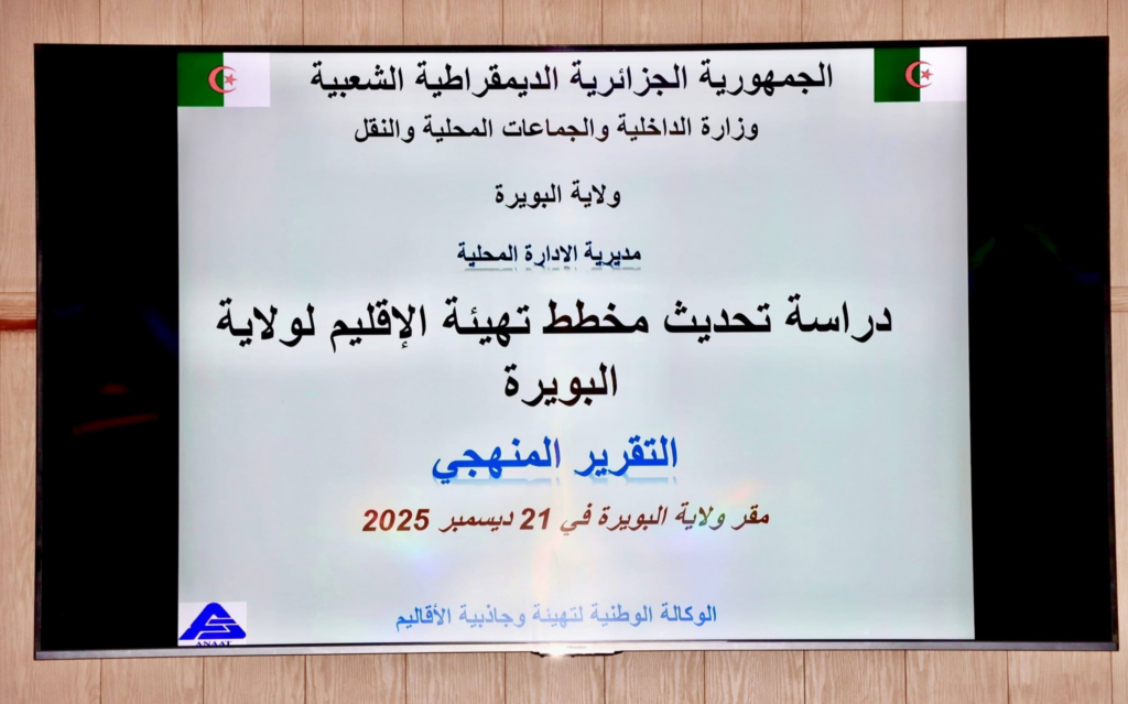 لتقديم عرض حول الدراسة الخاصة بالمرحلة التمهيدية لتحيين مخطط تهيئة الإقليم بالولاية، من طرف الوكالة الوطنية لتهيئة وجاذبية الأقاليم، وفق تقرير إعدادي يتضمن منهجية العمل المتبعة تعتمد على مقاربة تشاركية متعددة الفاعلين والقطاعات وفق ثلاثة مراحل وهي: تقييم تنفيذ مخطط تهيئة الإقليم لولاية البويرة ودراسة الديناميكية التي كانت قيد التنفيذ تجديد مخطط تهيئة الإقليم لولاية البويرة استناداً إلى التحولات المسجلة بين سنتي 2012 و2025 وضع نظام المعلومات الجغرافية والأطلس الجغرافي للولاية، مع إعداد لوحة قيادة تعتمد على مؤشرات قابلة للقياس.