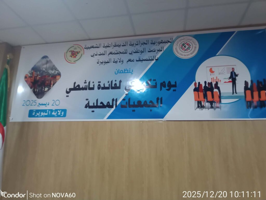 قصد ضمان المرافقة المنتظمة و المستمرة لفعاليات المجتمع المدني في مجال التكوين و تقوية القدرات التي تهدف لمرافقة دور المجتمع المدني لتحقيق التنمية المحلية وفق رؤية رئيس الجمهورية السيد عبد المجيد تبون ، نظمت بولاية البويرة أمس بالمكتبة الرئيسية للمطالعة المجاهد سعيداني رابح دورة تكوينية لفائدة الجمعيات المحلية في مجال بناء و تقوية القدرات، وهذا تحت اشراف المفتش العام للولاية والمرصد الوطني للمجتمع المدني.