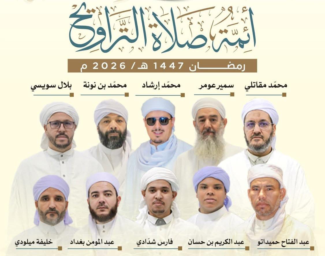 أعلنت إدارة الفضاء المسجدي لجامع الجزائر الأعظم عن أسماء الأئمة القرّاء الذين سيؤمّون المصلين في صلاة التراويح طيلة شهر رمضان المبارك لسنة 2026.