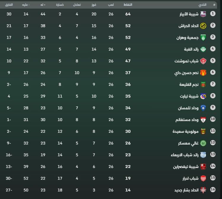 فيما كان اتحاد الحراش أكبر الخاسرين في الجولة، بعد سقوطه أمام منافس مباشر على المراكز المؤهلة إلى الملحق، إضافة إلى تقدم صاحب المركز الرابع رائد القبة إثر انتصاره الكبير أمام وداد تلمسان بنتيجة 4-1، إذ رفع رصيده إلى 49 نقطة، ليبقى التنافس محتدماً على المركزين الثاني والثالث، وذلك دون إغفال شباب تيموشنت الذي قد يخلق المفاجأة حيث يتواجد في المرتبة الخامسة برصيد 47 نقطة.