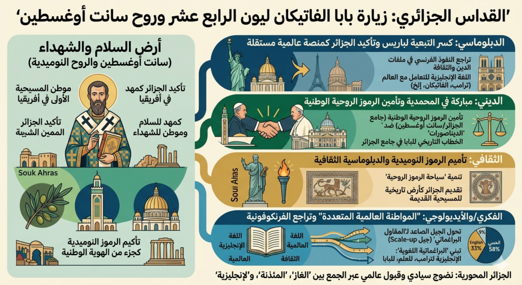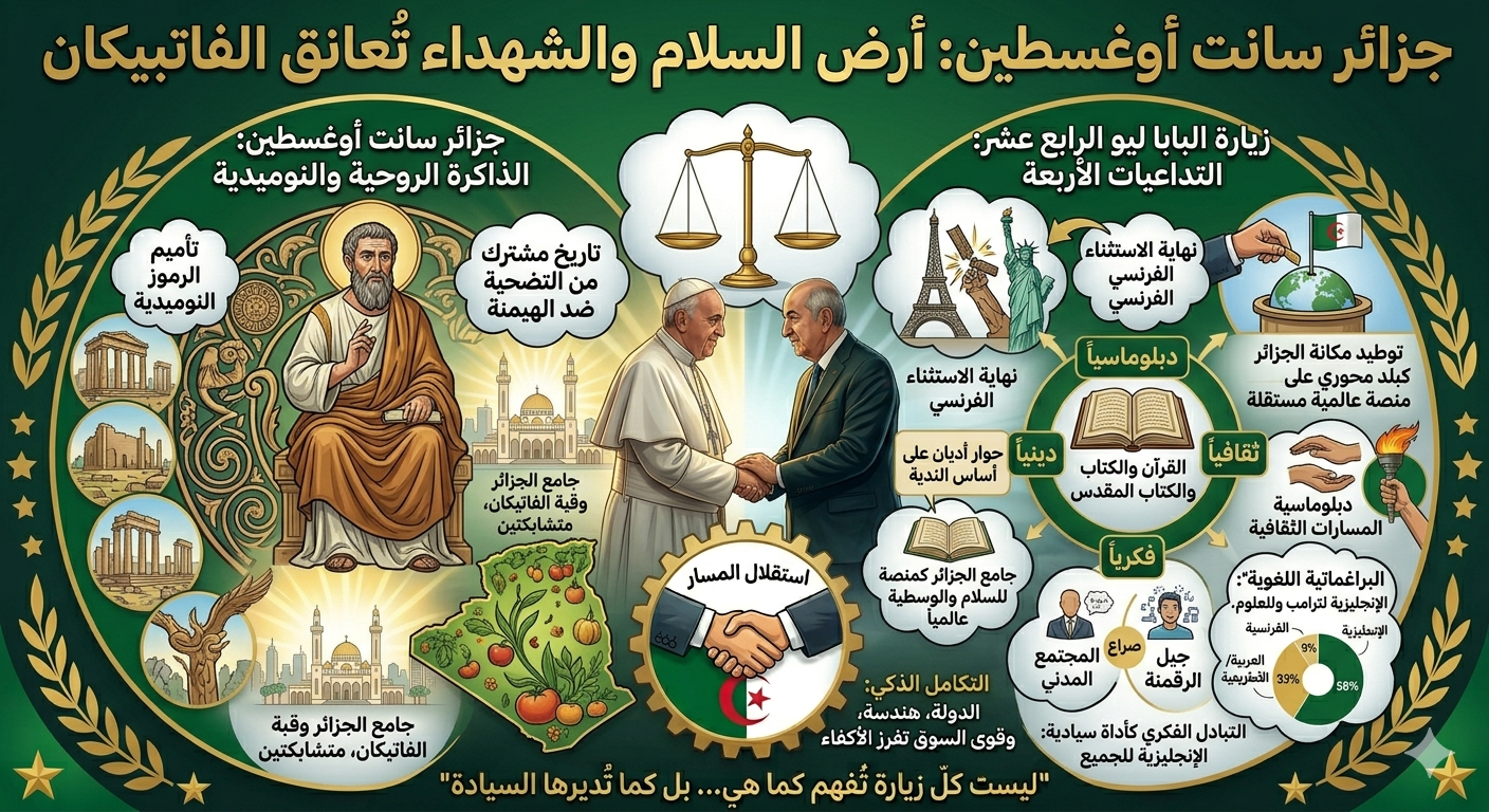 لم تكن زيارة بابا الفاتيكان ليون الــ14 إلى الجزائر مجرد زيارة عادية بل كانت زيارة تاريخية وسياسية بامتياز ،لأنها الأولى إلى الجزائر منذ الاستقلال ولأنها تزامنت مع مستجدات الشرق الأوسط ،ومواقف بابا الفاتيكان ليون الــ 14 من سياسة ترامب و مواقفه من الحرب على غزة وايران ،اختيار الجزائر لتكون المحطة الأولى وجسراً لربط العالم المسيحي الغربي والإسلامي ليس صدفة بل تزامن والتوجه السياسي والاقتصادي لإيطاليا نحو الجزائر ،زيارة البابا ليون الــ 14 إلى الجزائر في الفترة الأخيرة والتي حظي فيها باستقبال مميز فكان التصريح الأول لبابا الفاتيكان من العاصمة للإعلام الداخلي والعالمي (إن الجزائر بلد نبيل ،له تاريخ عريق وغني بتقاليده ،يمتد منذ زمن القديس اوغستين وقبل ذلك بكثير) ومن مقام الشهيد الى جامع الجزائر كانت الرسائل الدينية والسياسية والثقافية من أمام جامع الجزائر الأعظم بلباسه الأبيض الإسلامي الجزائري النوميدي الأصيل مرافقاً لبابا الفاتيكان لويس 14 ،ليختصر المشهد رسائل السلام والتسامح الديني لتكون )هيبون) عنابة المحطة الأخيرة حيث كانت العادات والتقاليد وتراث الجزائر الحاضر الأبرز في استقبال ضيف الجزائر ليصرح البابا ليون الــ 14 (إن شعب الجزائر لم تهزمه المحن قط ،لأنه شعب متجذر في التضامن وحب الخير)